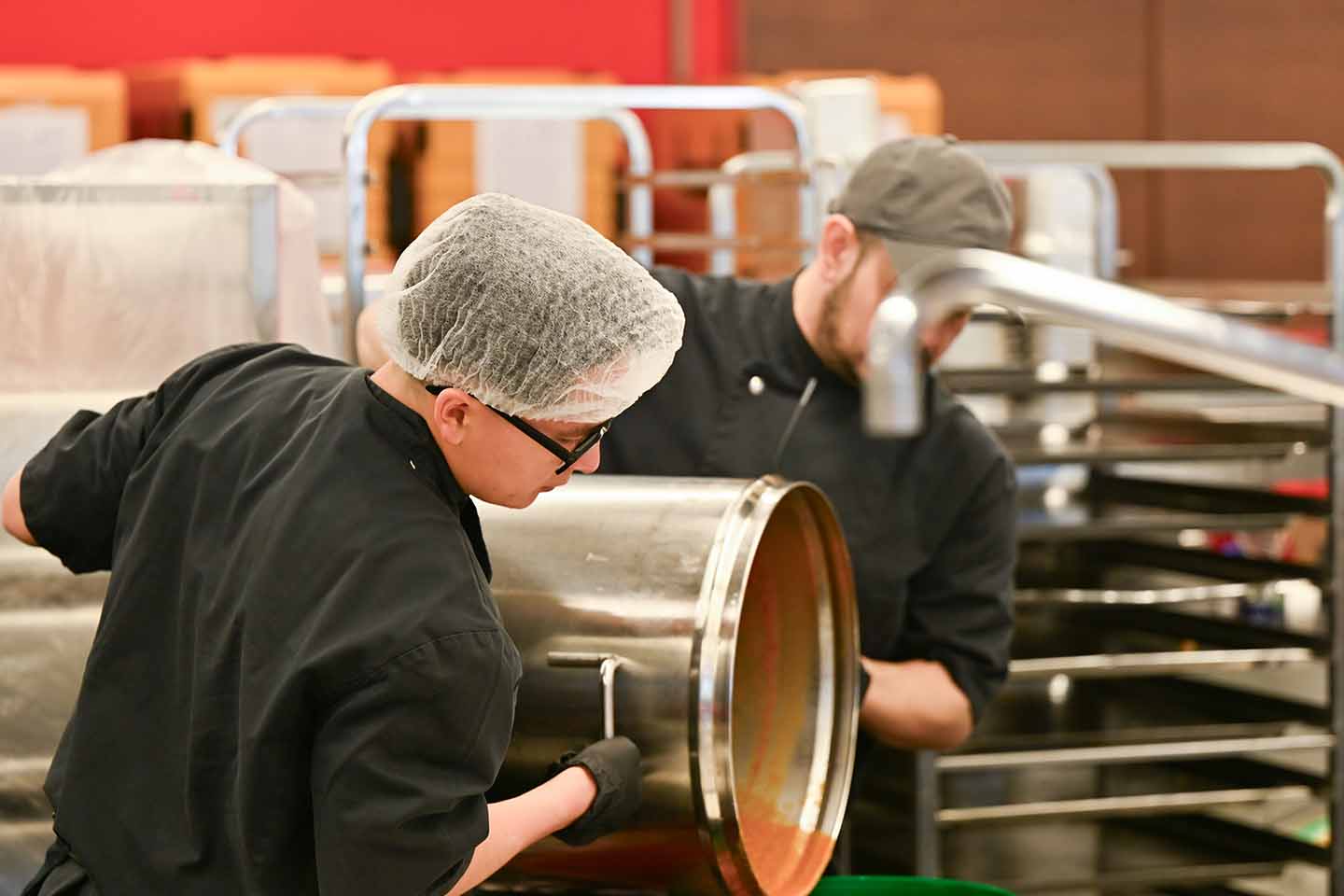 Thomas Wachter: Beim “Cook & Chill” – auf deutsch “Kochen und Kühlen” – geht es darum, dass das gekochte Essen schockgefroren wird. Es wird innerhalb von 90 Minuten auf 4 Grad Celsius abgekühlt. Es kann dadurch kalt ausgeliefert werden und wird dann vor Ort regeneriert – das heißt wieder warm gemacht. Das Essen bleibt dadurch frisch. Durch “Cook & Chill” kann bereits vieles am Vortag gerichtet werden. Generell ist bei uns um 6 Uhr am Morgen Start in der Küche.
